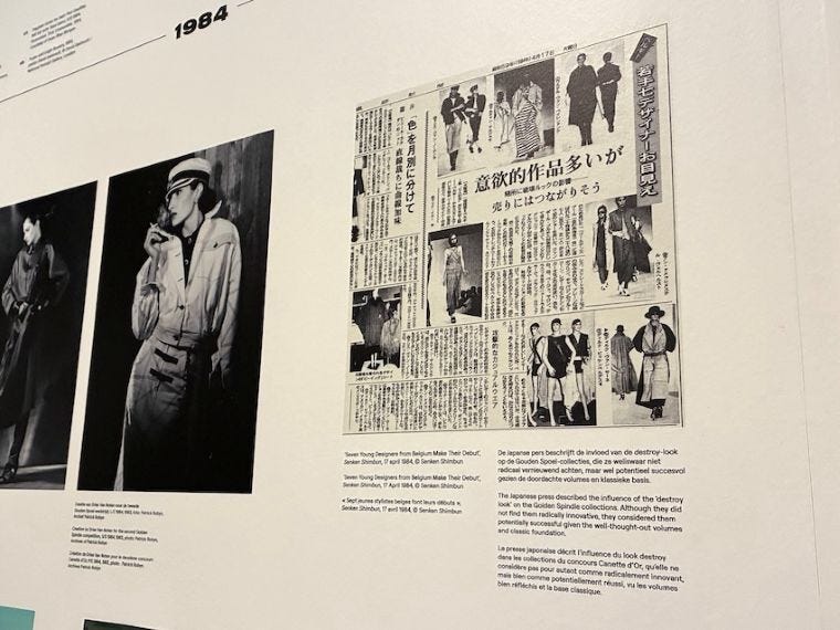上の写真は、展覧会で紹介されている繊研新聞1984年4月17日付の紙面。アントワープ・シックスにマルタン・マルジェラが加わった7人が、来日して大阪で合同ショーを行った時の記事である。ベルギー政府は当時、繊維産業の近代化と輸出拡大を目指し、若手デザイナーを対象にしたコンテスト「ゴールデン・スピンドル(金の糸巻き)」賞を開催していたのだが、7人は2年目の最終審査に残った駆け出しのデザイナーたち。初めて外国で行ったショーの資料として展示されている。ちなみにこの年の大賞はダーク・ヴァン・セーヌが射止めた。