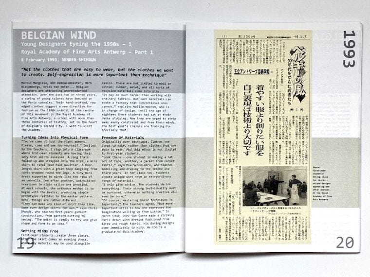 実はこれ、1993年に日本人として初めて王立アントワープ芸術学院のファッション学部を取材した私が記した繊研新聞の連載「ベルギーの風」の翻訳本。1993年の9回連載、1998年の5回連載、それに装苑2001年10月号に寄稿した「アントワープ・ファッションの変遷」のオリジナルの紙面の画像と英文翻訳、当時撮影された写真で構成されている。