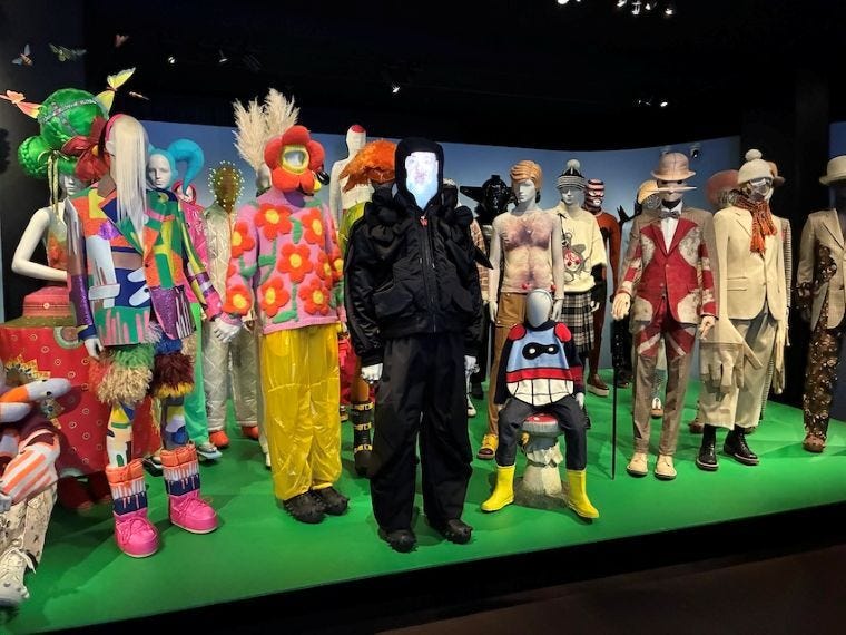 次はぐっとカラフルでプレイフルなウォルター・ヴァン・ベイレンドンク。6人の中で唯一今なおパリでショーを披露している現役のウォルターは、自らがキャラクターとなって登場するなど楽しいコレクションを発表し続けている。展示は、中央のマネキンの顔がモニターになってウォルターが話しているというユニークなもの。