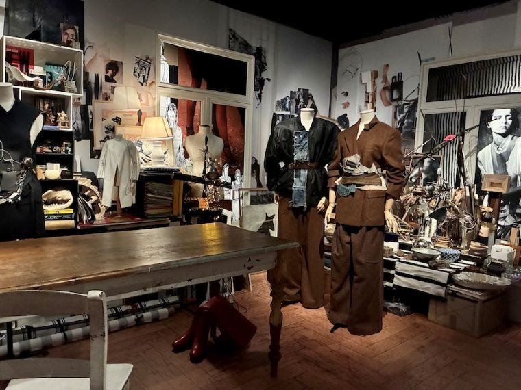 そして、ある意味1番の見どころとも言えるのが、自宅のアトリエを再現した部屋を窓の外から覗く形のマリナ・イーのコーナーかもしれない。他の5人が相次ぎパリデビューしてブランドを成長させていく中、ファッションから身を引いて舞台衣装やカフェ経営、インテリアなどの仕事をしていたマリナ。そのミステリアスな存在の彼女はここ数年ファッション界にカムバックして、クラフトタッチのテーラードや折り返した裾がほつれたアーティスティックなジーンズなどをデザインしていた。ところが、これからといった矢先の昨年11月1日にこの世を去った。ジーンとくるコーナーである。