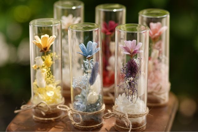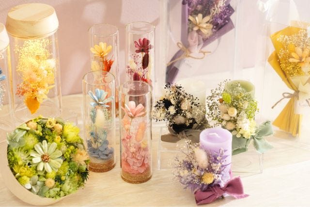 また、1束500円から購入できるドライフラワー花材も用意。インテリアやプチギフトとしておすすめです。「LEDボトルフラワー」は、光と花を組み合わせたインテリア性の高いギフト。空間に飾りやすい「フレームフラワー」は、大切な人への贈り物にぴったりです。