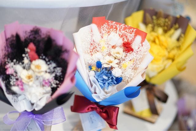 銀座店・有楽町店で人気を集める「推しカラー花束」にも注目を。多彩なカラーバリエーションから、推しのイメージに合わせた花束を作成。ライブやイベントの記念、誕生日ギフト、自分へのご褒美として“枯れない思い出”を形にできます。