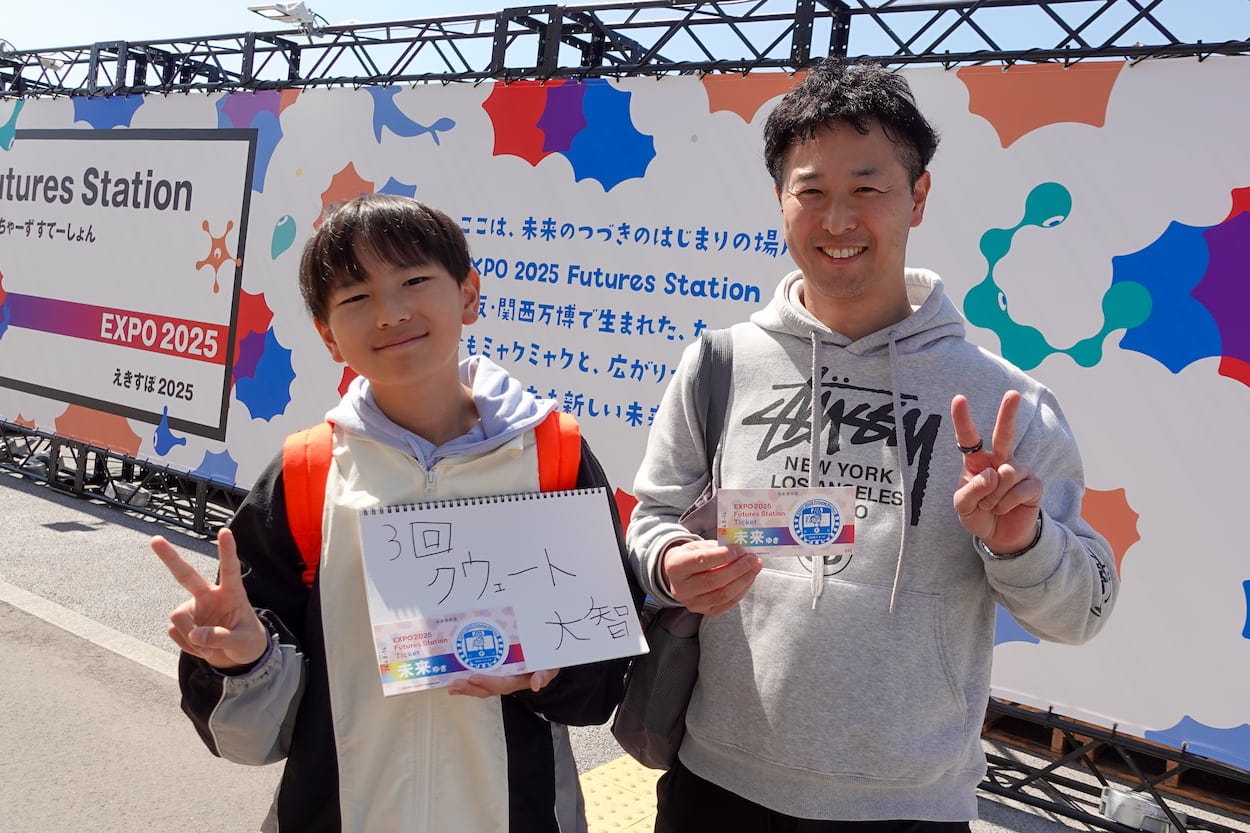 大阪・関西万博には3回遊びに来たという大智くん(写真左)。「どのパビリオンも全部すごかった!」と目を輝かせながらも、推しパビリオンは、クウェート館だと教えてくれました。特にお気に入りだったのが、迫力満点の滑り台! そんな大智くんの楽しそうな姿を隣で見守っていたお父さんも、家族みんなで万博の思い出ができたことに、とても満足げな表情を浮かべていました。