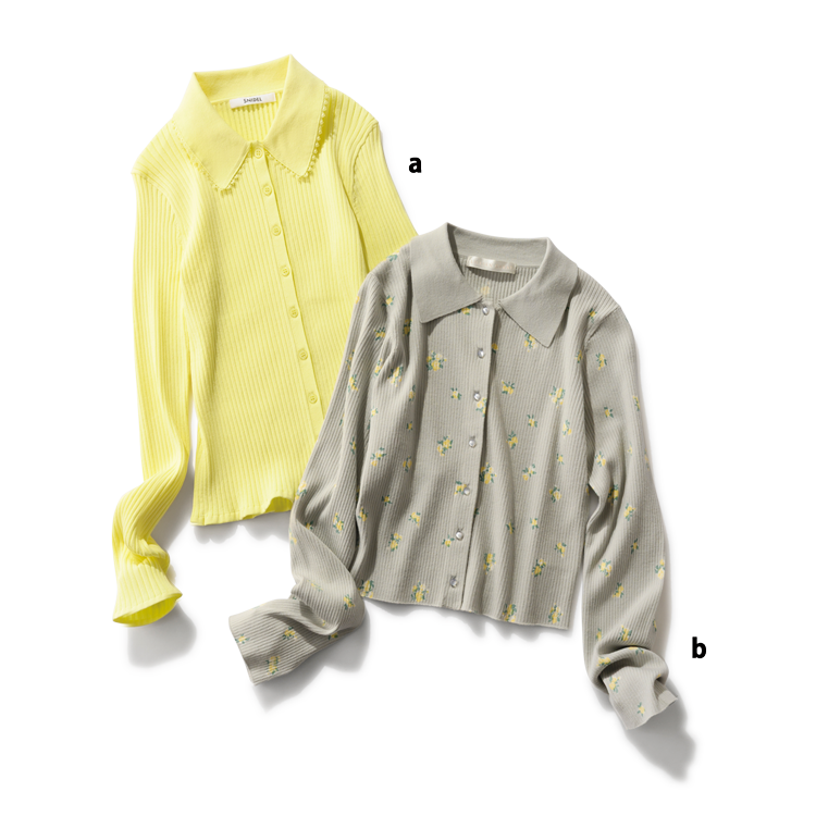 コーディネートに効かせたい色や柄は、羽織れるデザインで着こなし力も手に入れて。シャツデザインのニットならカーデとはまた違った印象に。