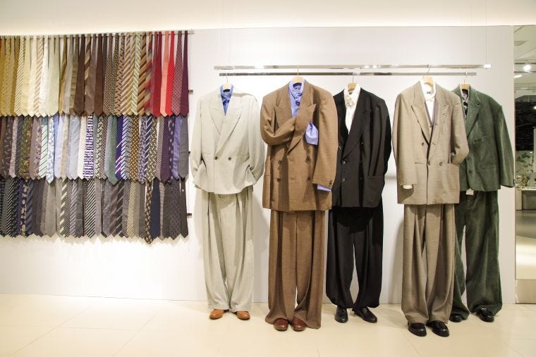 期間限定店は昨年、LVMHプライズのグランプリを受賞したクリエイションを空間全体で体感してもらいたいと、デザイナーの大月壮士氏に演出を任せた。トルソーではなく、〝つるし〟で5体のスーツを飾り、その隣に大月氏が集めたビンテージのネクタイを棚3段にびっしりと並べた。欧州ブランドのライセンス商品もミックスされる。