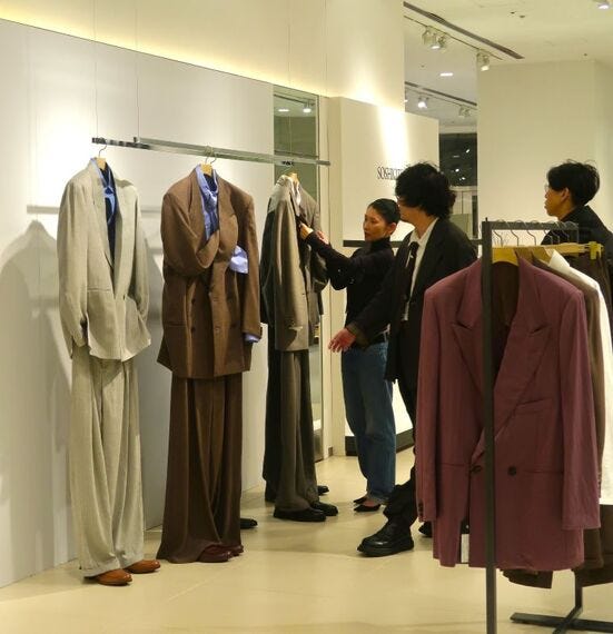 「ファッションが好きで、頑張って憧れのブランドを買う若い世代の熱量を実感する。普段は個店のセレクトショップで扱っているインディペンデントのブランドには、しっかりとコミュニティーが存在している」と話すのは、ウィメンズのチーフディレクターの藤井かんなさん。ソウシオオツキの80年代の日本のサラリーマンのソフトスーツを再解釈したスタイルに魅力を感じ、今春夏から扱い始めた。