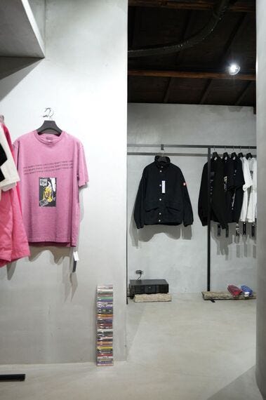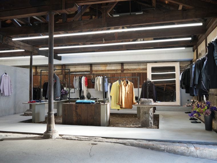 TCF京都の運営で培ってきた「ファッションファースト」の考えを受け継いで、店を構成した。内装は工場跡地の風情を残しながらも、モルタルで無機質な印象に仕上げて服が際立つようにしている。店舗面積は庭を含めて380平方メートルで、藤井大丸の店舗と比べて1.5倍になった。黒田代表は「ブランドを体験してもらえる静かな空間と広さがある物件を探した。ファッションを起点としたアートや写真などのエキシビションもやっていきたい」と話す。