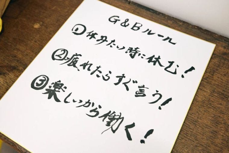 「三つのルール」は①休みたい時に休む②疲れたらすぐ言う③楽しいから働く。「五つのアイデア」は、①座って接客②注文は「オーダーシート制」③営業中でも自由に休憩④サポートスタッフが常駐⑤忙しい時や人手が必要な時には客に手伝ってもらう「孫」制度。