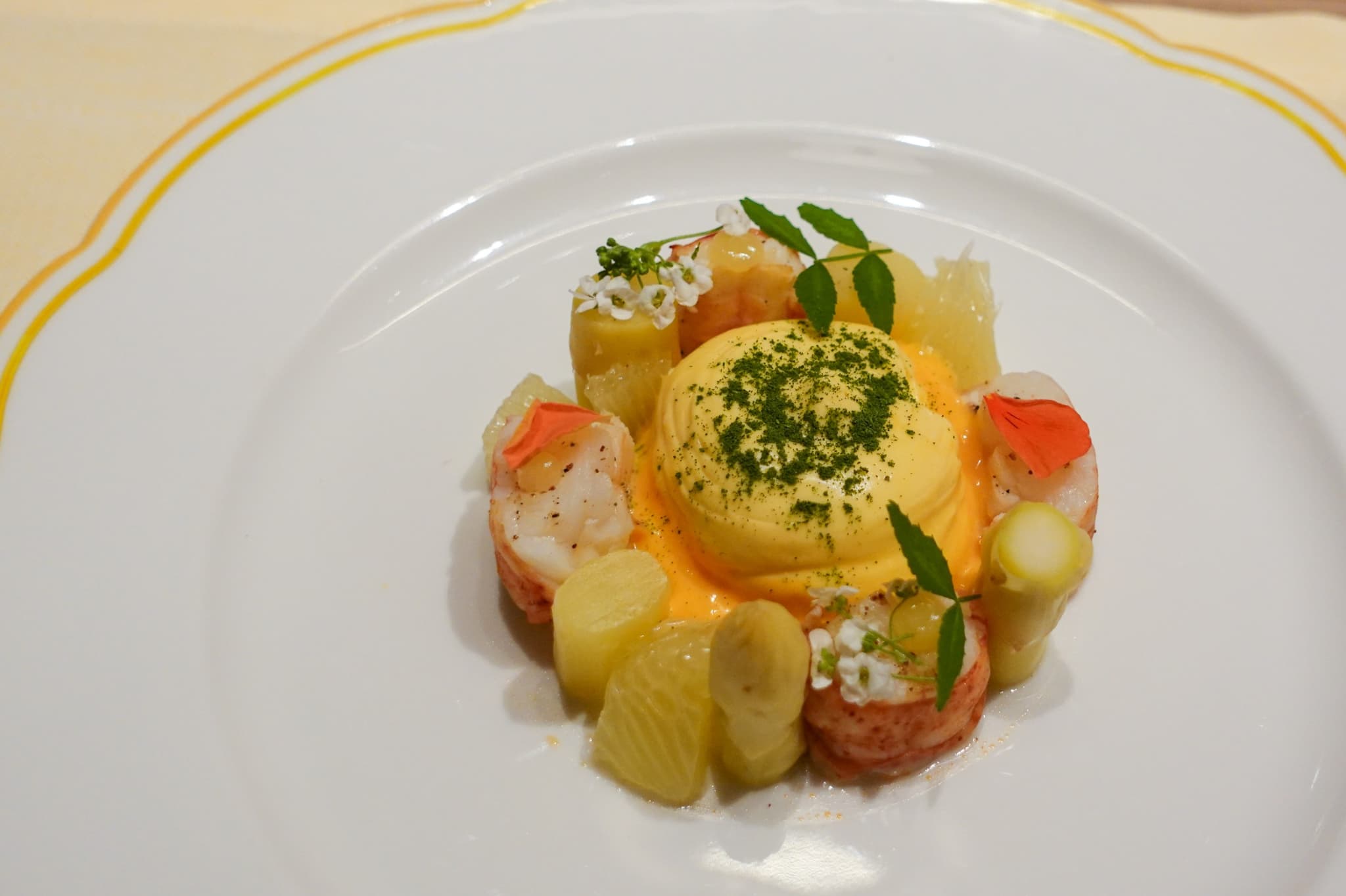 (左)「フォアグラとデコポン~この場所で生まれた、新たな幕開け~」、(右)「オマール海老のポシェ~眼下に広がる、瑞々しい緑の情景~」 スターターは一口サイズの前菜「フォアグラとデコポン~この場所で生まれた、新たな幕開け~」。フォアグラのテリーヌに、デコポンの鮮やかな酸味を合わせたオードブルで、スパイスが香るサブレもアクセントに。「オマール海老のポシェ~眼下に広がる、瑞々しい緑の情景~」は、オマール海老の甘みをオランデーズソースと共にいただく一皿。木の芽のパウダー、菜の花のピューレ、高知県産文旦の酸味も重なり、香りも後口も爽やかです。