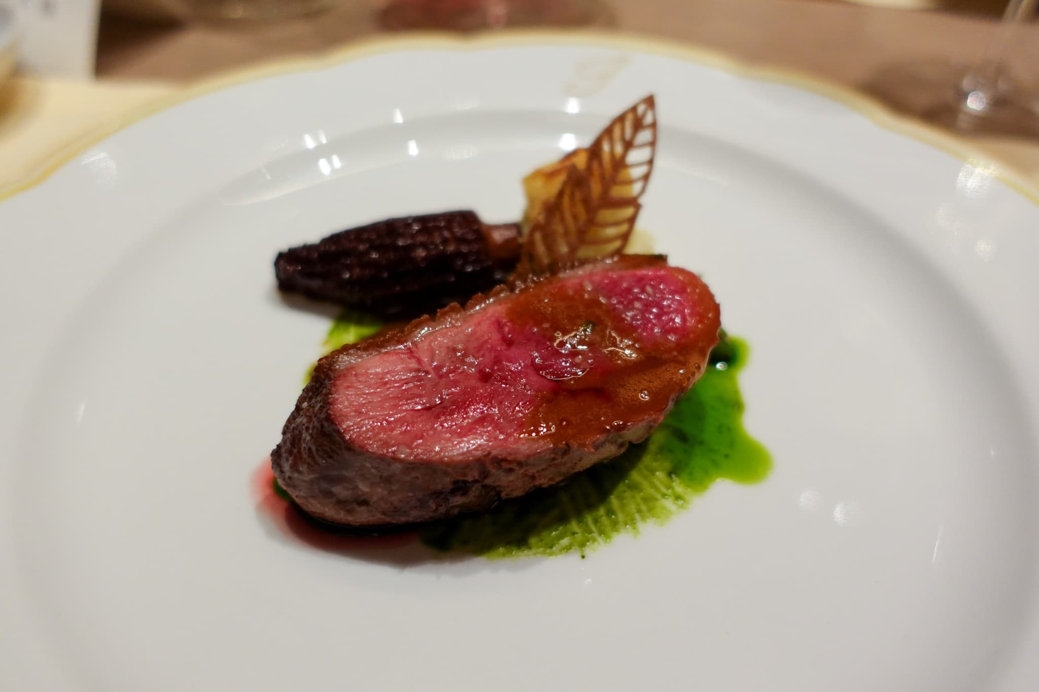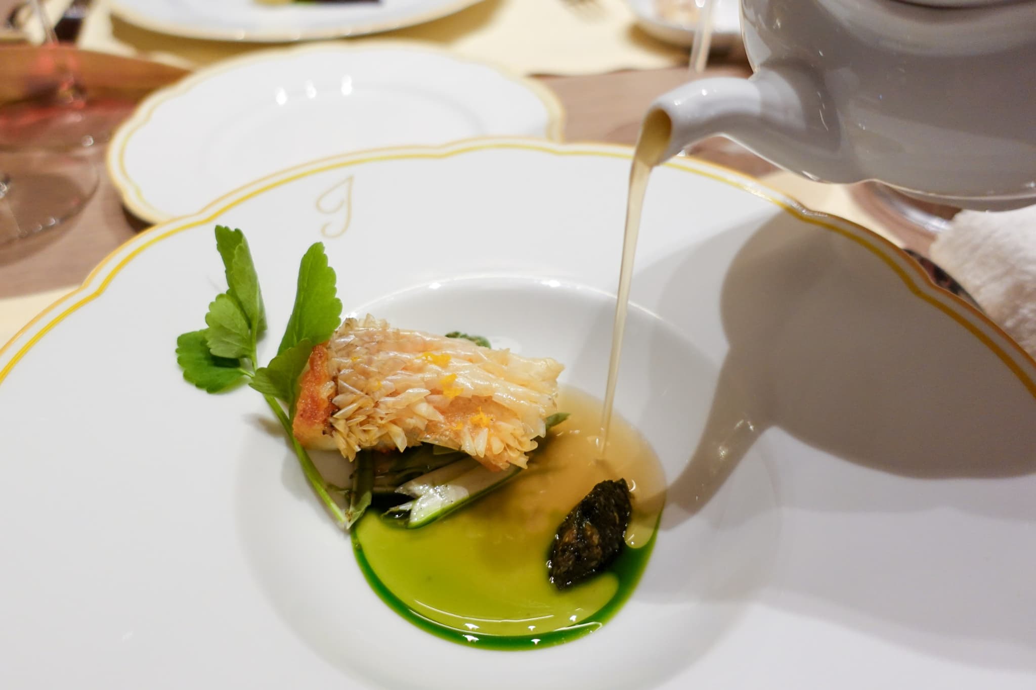 (左)「甘鯛の鱗焼き~水都に広がる、光の情景~」、(右)「七谷鴨胸肉のロティ~共に歩んだ1年、そして未来へ広がる森~」 「甘鯛の鱗焼き~水都に広がる、光の情景~」は、香ばしく焼き上げた甘鯛に、甘鯛の骨で出汁をとったコンソメスープを注いで提供されます。澄んだコンソメスープに浮かぶアサツキのオイルが美しく、香りの良さが格別。「七谷鴨胸肉のロティ~共に歩んだ1年、そして未来へ広がる森~」は柔らかく、噛むほどにほのかな甘みと深みのあるうま味が広がります。