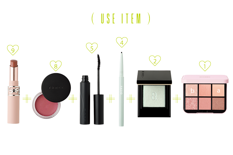 平成ギャルではないNEOっぽさを出すには、目元にはトレンドのグリーンで軽さを、チークは可愛げに見える横長な入れ方でファッション同様、甘辛MIXすること!
