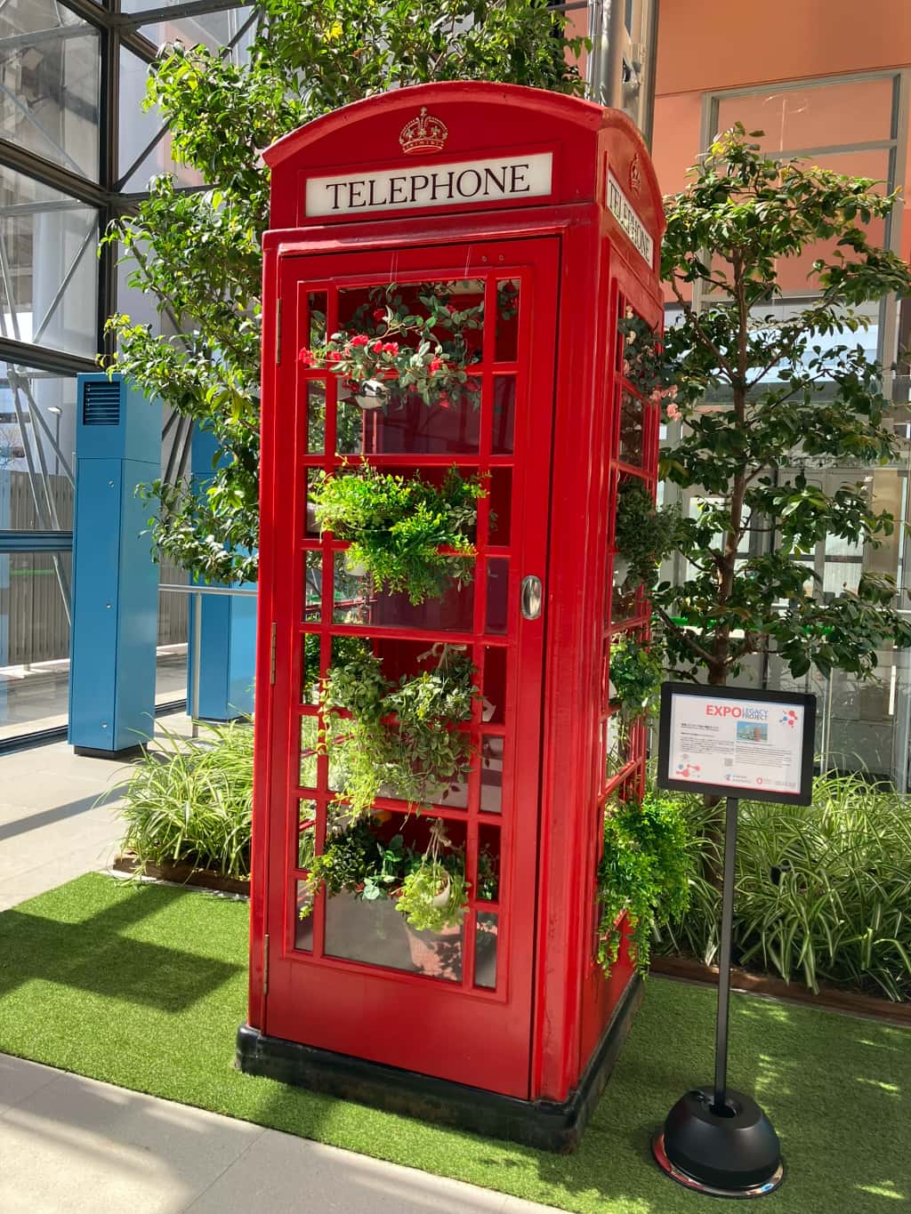 関西国際空港移設後 今回、関西国際空港に移設された「赤い電話ボックス」は、英国の街中で実際に使用されていたもの。万博会場ではアイビーなどの植物で装飾され、英国を思い起こす美しいフォトスポットとして人気を集めていました。