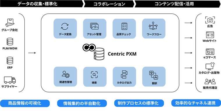 PXM(商品体験管理)は、商品情報を一元管理する仕組みのPIM(商品情報管理)と、画像・動画などのデジタルアセットを管理する仕組みのDAM(デジタルアセット管理)の2つの概念を統合・拡張したもの。小岩氏は「Centric PXMでは、パーソナライゼーション、販売チャネルごとの最適化・コンテンツ分析の機能を備えている。常に商品情報を最適な形に改善し続けることが実現できる」と強調した。