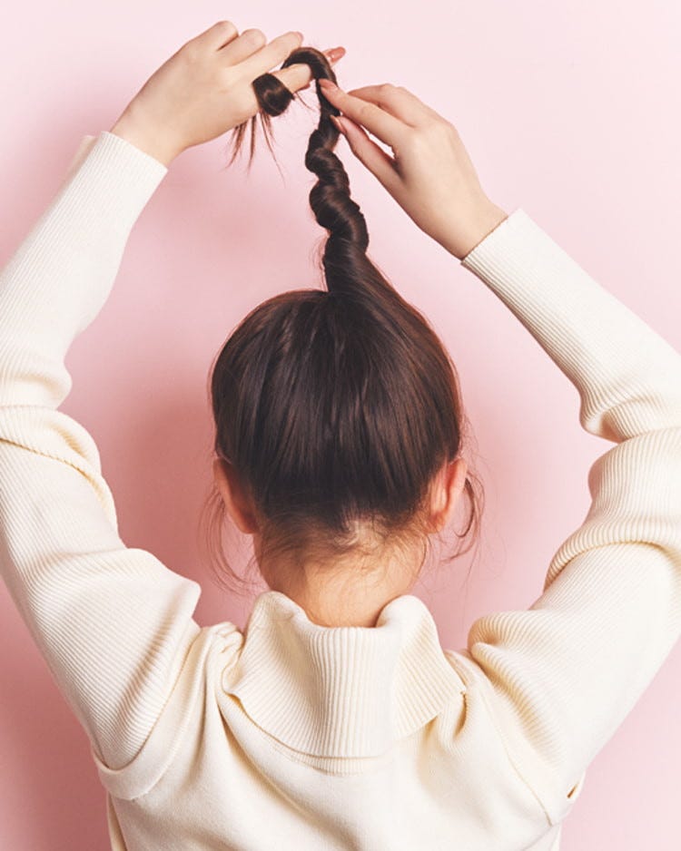 手グシでざっくりと髪をひとつにまとめる。ポニテを作る要領で後頭部の中心で髪をひとつにまとめたら、そのまま毛束をねじり上げる。毛束は真上に引っぱりながらねじるのがコツ。