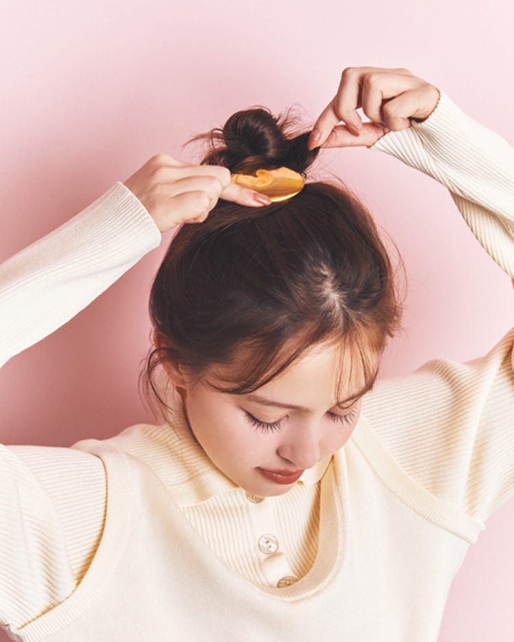 おだんごにした毛束と頭頂部の髪を一緒にはさむようにして、バレッタで固定する。そのあと、バランスを見ながらおだんごから少量ずつ髪を引き出して、ほつれたニュアンスを加えて。