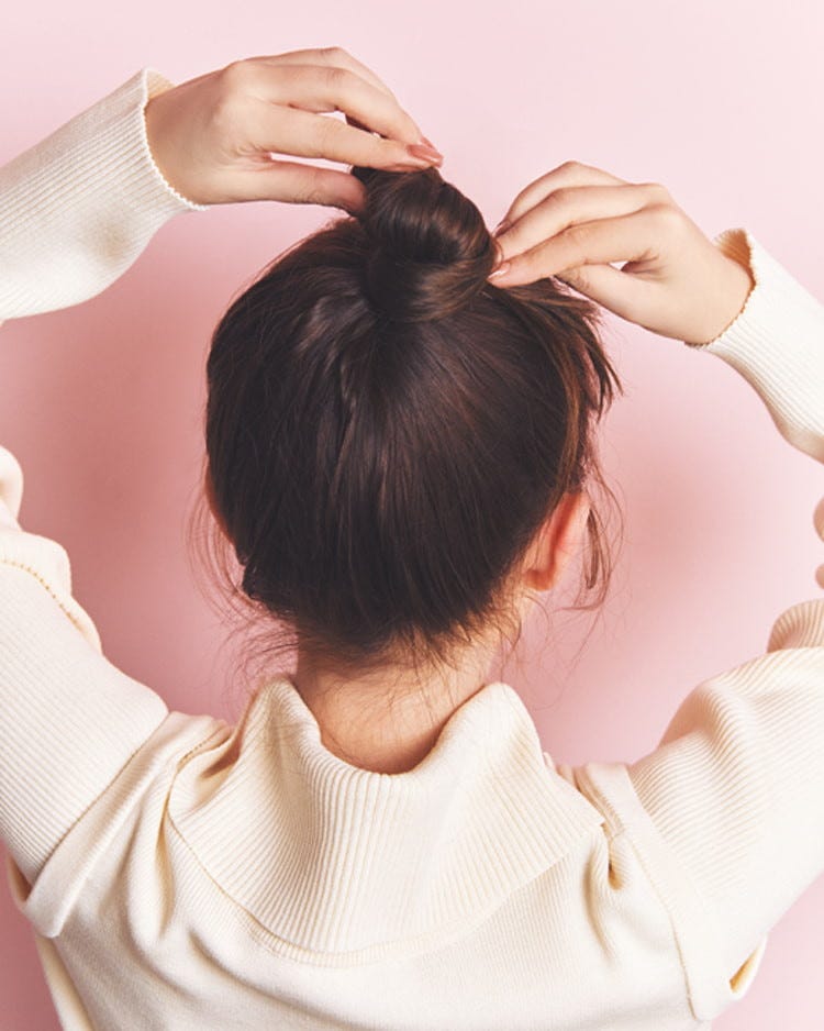 ねじった毛束は、根元を中心にぐるりと巻いておだんごに。このとき毛束の先は下にくる状態にしておく。おだんごの形がいびつでも、短い毛が飛び出ててもOK。このテキトーさがおしゃれ!