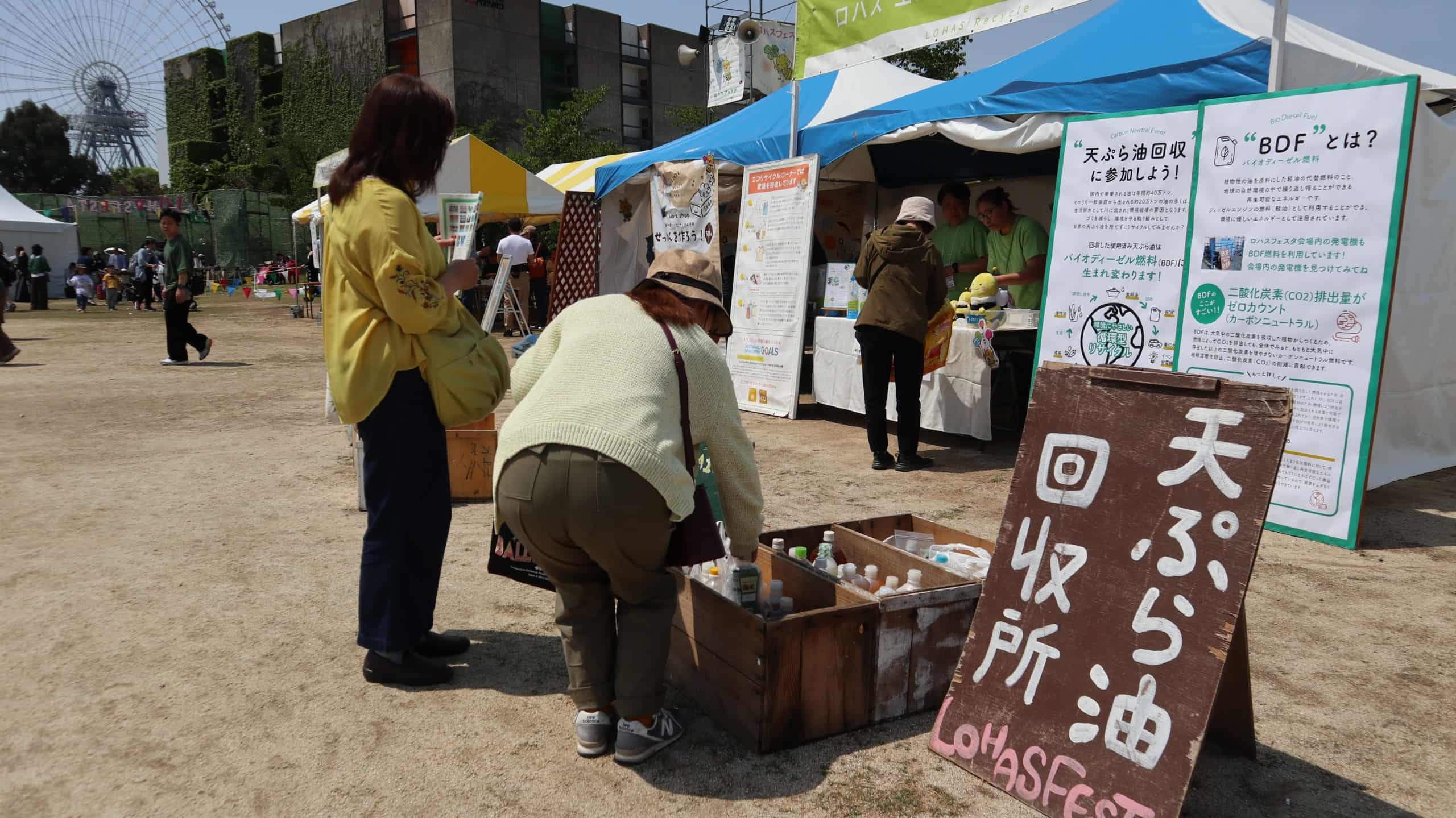 エコリサイクルコーナー 会場内には、使用済みの天ぷら油や牛乳パックなどを回収する「エコリサイクルコーナー」が設置されています。回収された天ぷら油は、BDF(バイオディーゼル燃料)に精製され、会場内の電力として使用されます。