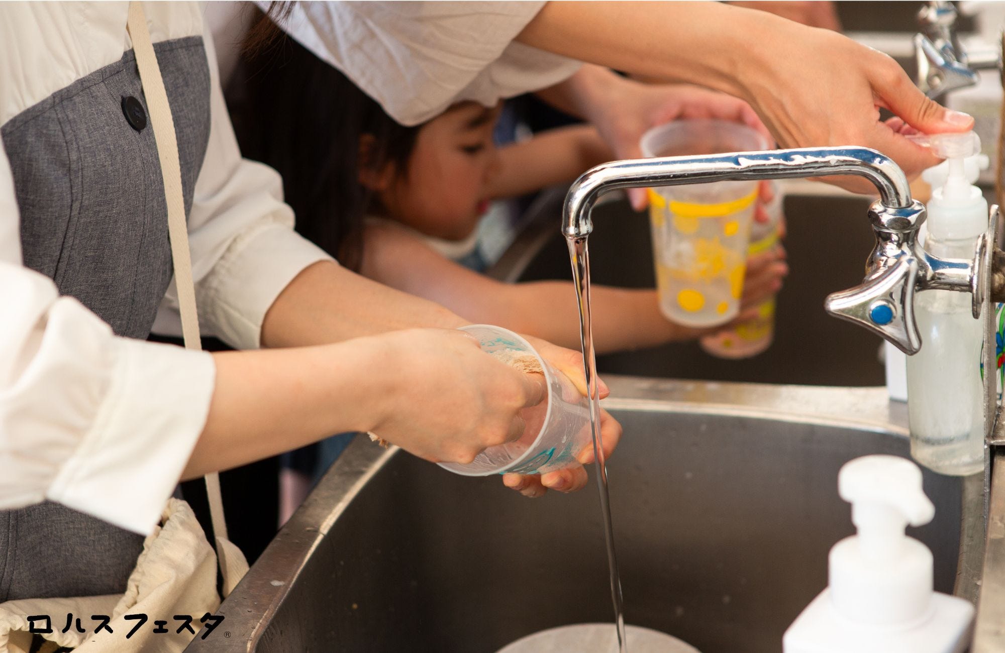 特設の食器洗い場 また、会場内では繰り返し洗って使えるリユース食器のみを使用。使い捨て容器の削減を徹底し、ごみゼロを目指しています。