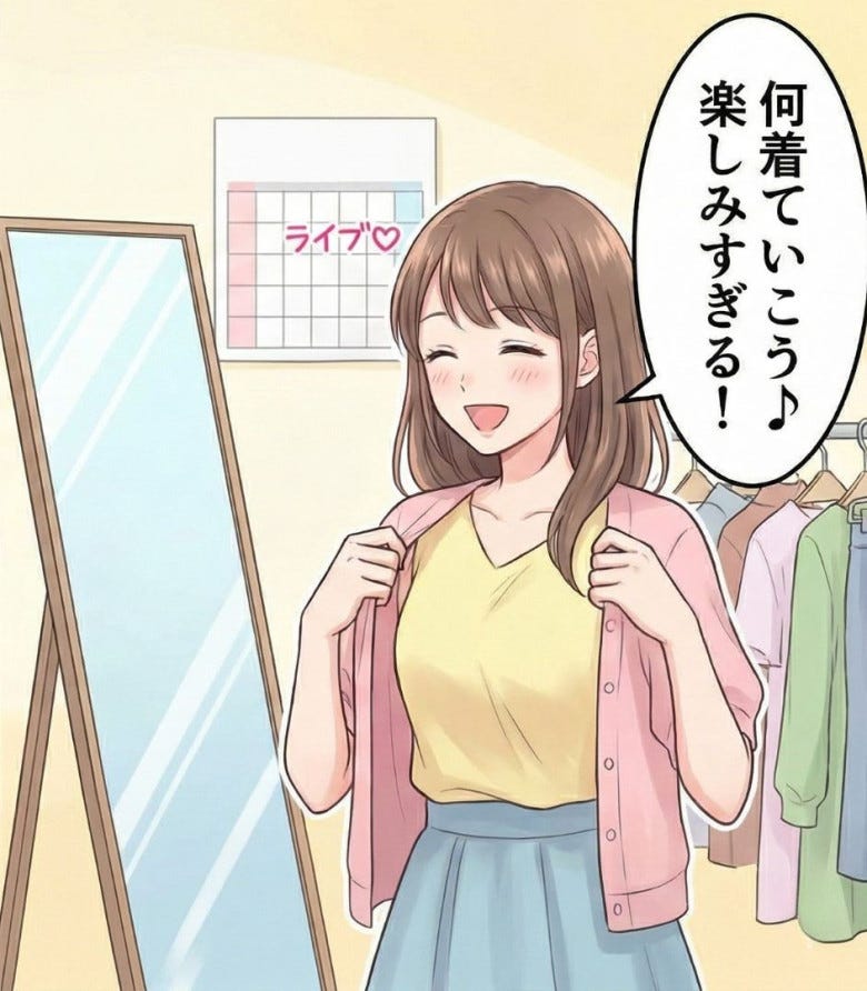 ライブの約束をしてから、毎日は一気に楽しくなりました。服や髪型を考えたり、ライブの予習をしたり――そのすべてが幸せな時間でした。