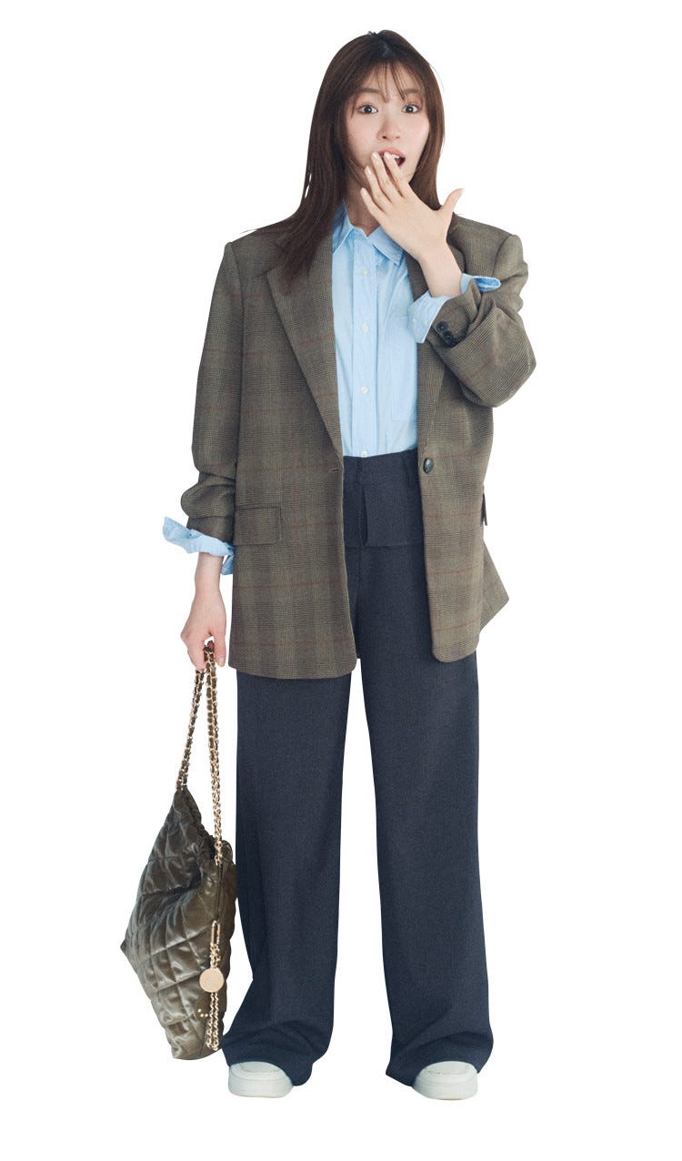 フリルつきスラックスは着回し。ブルーシャツ 3,990円/UNIQLO チェックジャケット 24,900円/MANGO バッグ 8,998円/SLY(バロックジャパン リミテッド)スニーカー 17,600円/プラス ダイアナ(ダイアナ 銀座本店)