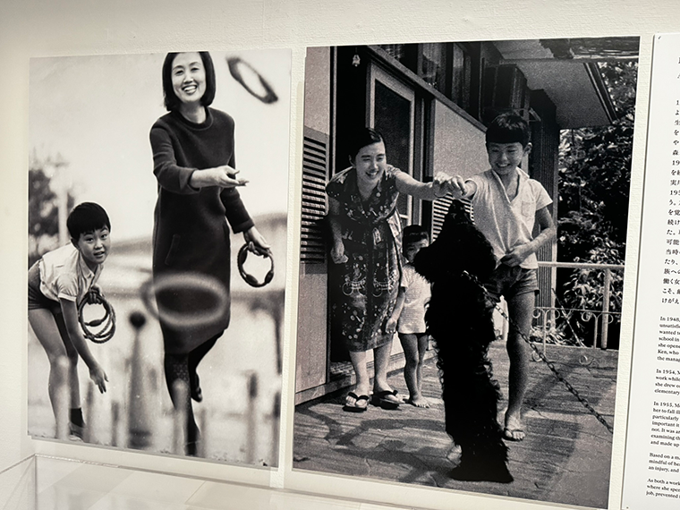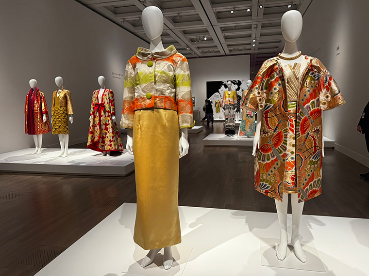 大学卒業後、結婚、出産を経て洋裁を学んだ森は、子育てをしながら51年にスタジオを兼ねた店「ひよしや」をオープン。そこから映画衣装の仕事で実力を養い、65年にニューヨークに進出した。注目されたのは、帯地で仕立てたコートやちりめんのドレスなど日本的な美の表現。その鮮やかな色彩は今見ても美しくモダンだ。77年にはアジア人として初めて、パリ・オートクチュール組合に正会員として加盟。04年まで27年にわたり発表したコレクションも展示されている。