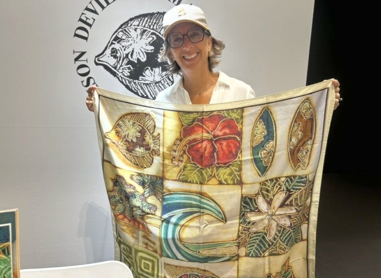 「メゾンドゥヴィエンヌ」(F-08)はアート性の高いスカーフのブランドだ。豊かな自然や文化に着想してタヒチで描かれた絵画をもとに、リヨンの工房でプリントしている。