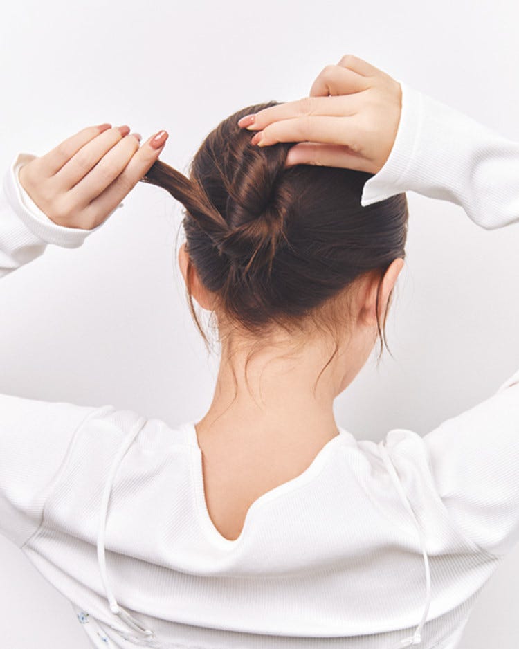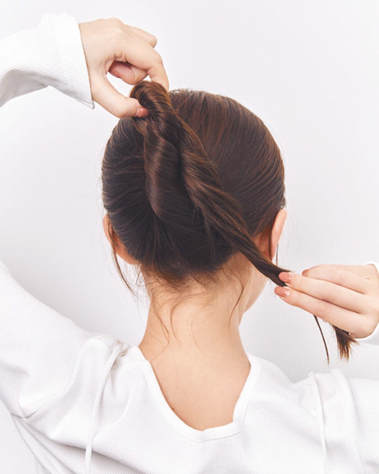 まとめた毛束を、後頭部に沿わせるように持ち上げながらねじる。毛先付近までねじったら、毛先を下に向けて毛束を半分に折る。このとき折り目となる位置を持って1回ひねっておく。