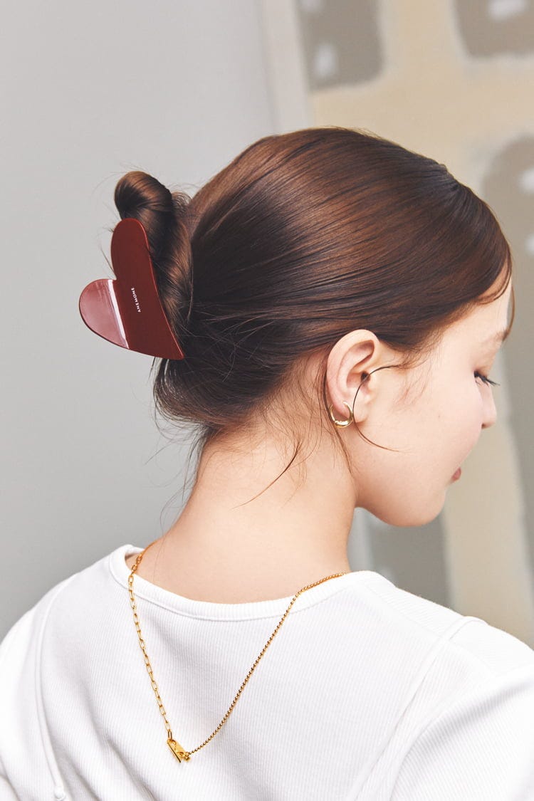 サクッととめるだけで決まるクリップは、ラフなヘアアレに使いがち。それなら、いつもとは違うビシッとタイトに決めたアップヘアにあわせてみて。キュートなハートもオトナ顔にチェンジ♡