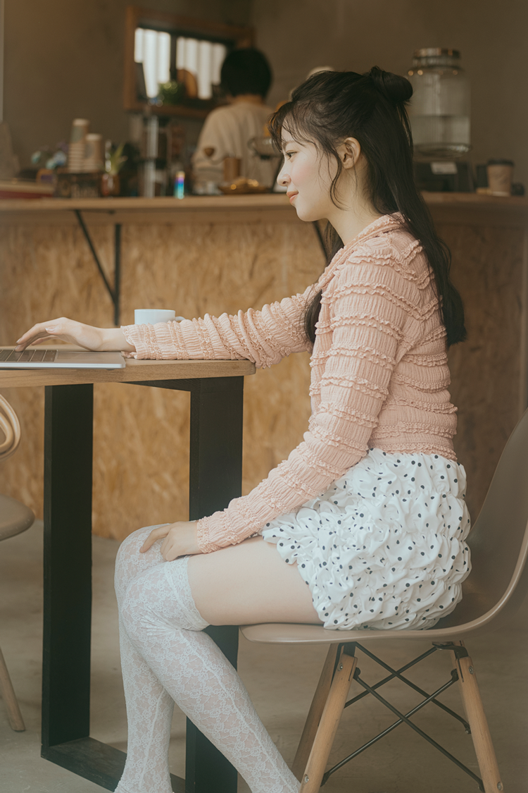 ドット柄ミニスカートは着回し。キャミソール(カーディガンとキャミソールのセット)8,998円/SLY(バロックジャパンリミテッド)ジップブラウス(ジップブラウスとスカートのセット)16,940円/REDYAZEL ルミネエスト新宿店 レースシュシュ 3,520円/Carmelo(アンティローザ)メガネ 13,000円/OWNDAYS ソックス 1,210円/靴下屋(Tabio)バレエシューズ 11,900円/NADIA FLORES EN EL CORAZON