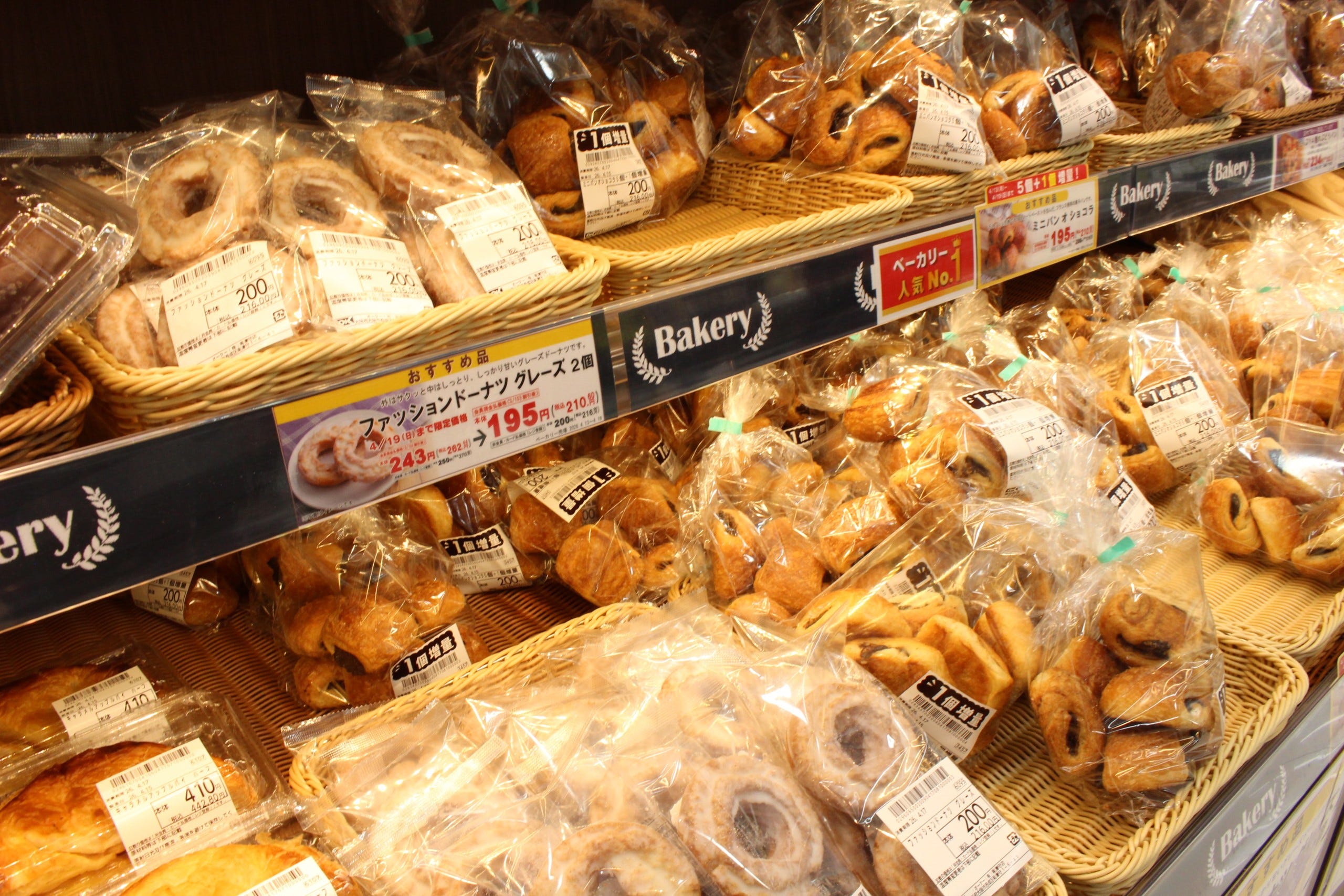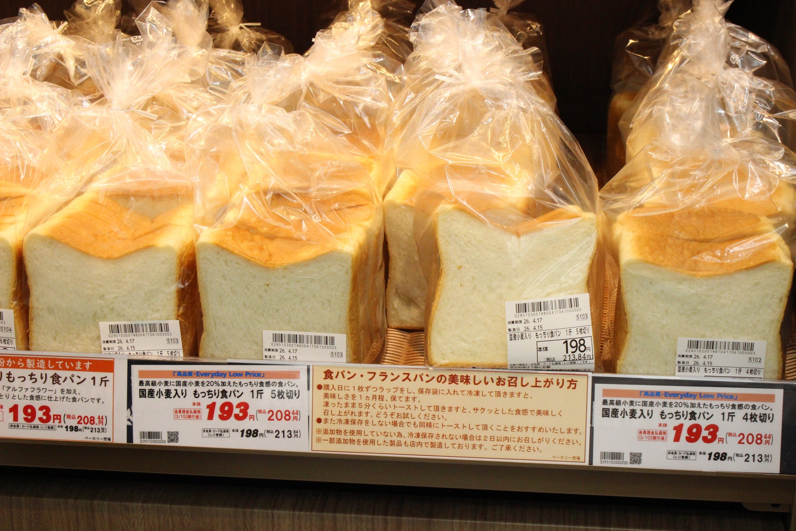 店内で焼き上げるベーカリーコーナーもおすすめ。惣菜系から甘い系まで幅広い商品がそろい、ついあれこれ選びたくなる楽しい売場です。独自に小麦粉をブレンドし、生地から店内で手作りするもっちり食感の食パンは、「このクオリティでこの価格」と驚く声も多い人気商品です。