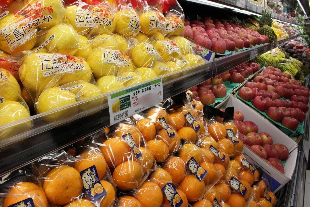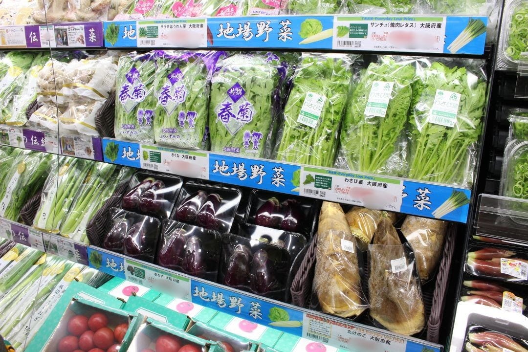 青果売場には旬の食材がずらりと並び、大阪や京都など近郊で採れた地場野菜も豊富にラインナップ。フルーツも充実し、彩り豊かな売場が広がります。