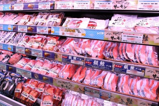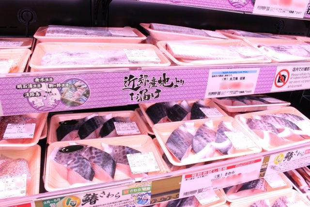水産売場にはまぐろの刺身をはじめ多彩な種類の鮮魚がずらり。切り身やシーフードミックスなど冷凍商品も幅広く取りそろえ、用途に応じて選べる品ぞろえです。