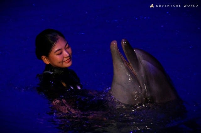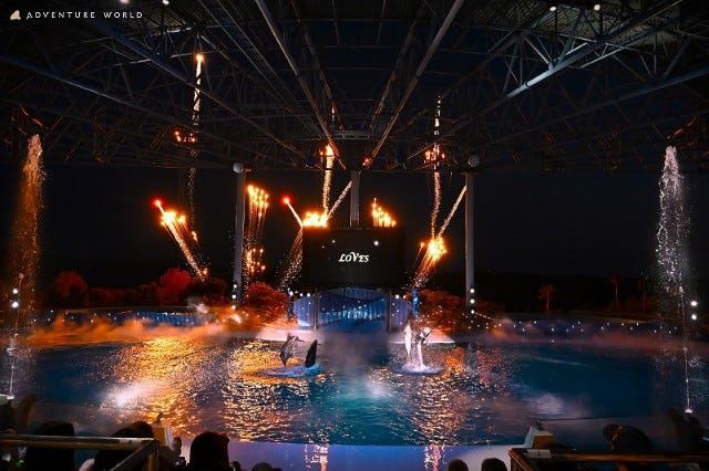 ナイトマリンライブ「LOVES」 夜の静寂に包まれた「ビッグオーシャン」で繰り広げられるのは、イルカ・クジラとトレーナーがまっすぐな愛の物語を紡ぐナイトマリンライブ「LOVES」。