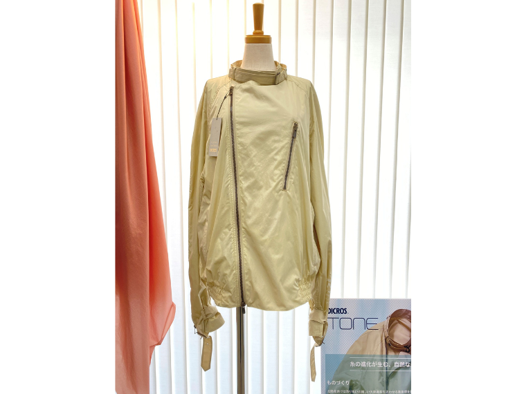 ディクロス・トーンは地場の北陸産地と協業して独自開発した糸がポイントで、陰影のある糸を高密度で織った。光沢が奥行きを演出し立体感がありつつも、見た目に反して軽やかな風合いだ。27年春夏向けでは15デニールの糸を使ったタイプやバックサテンなど5品番を作った。すでに海外ブランドから引き合いがある。