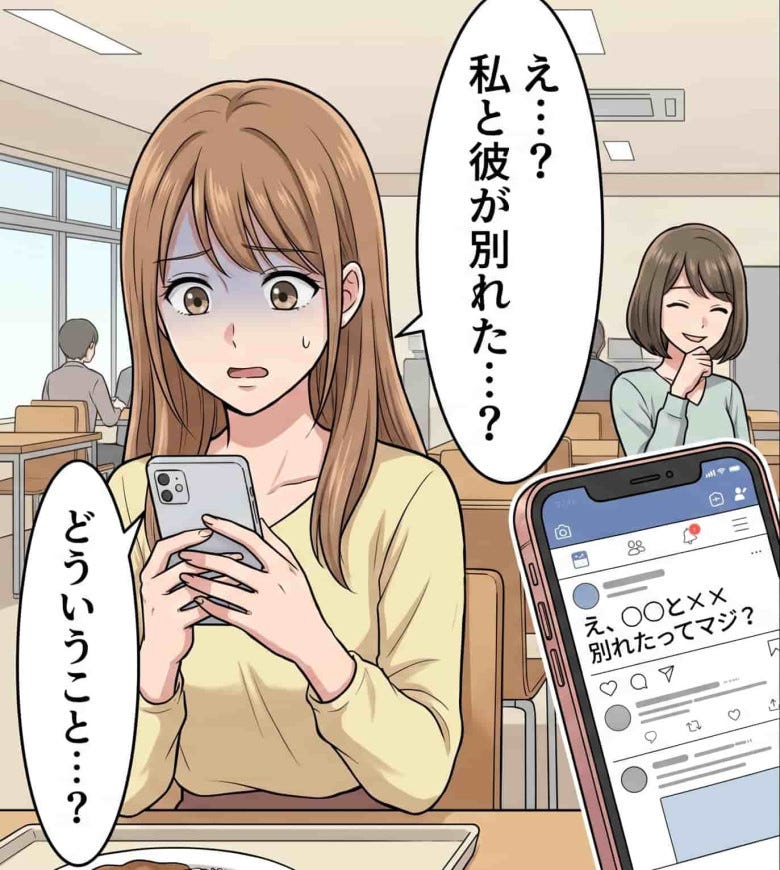 読者の実体験をもとにした衝撃エピソードをご紹介!同じサークルの彼氏と順調に交際していた私。しかしある日、身に覚えのない「別れた」という噂が広まってしまいます。その裏には、思いもよらない人物の影がありました――。