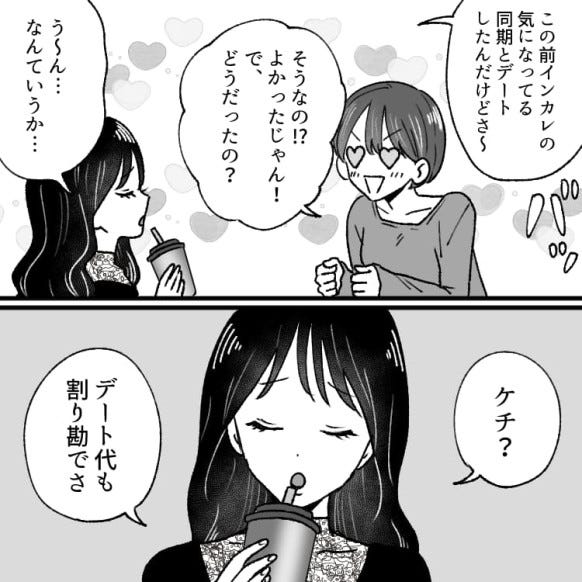 「デート代も割り勘でさ...」友だちが気になる彼に【衝撃発言】を...それを聞いて主人公ドン引き!?