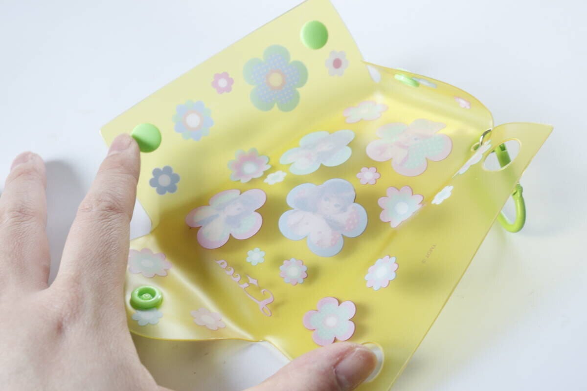 スナップボタンを外すと上下に大きく開くフルオープン構造。「ガチャ詰めポーチ」という名の通り、中身のレイアウトを確認しながら収納できます。