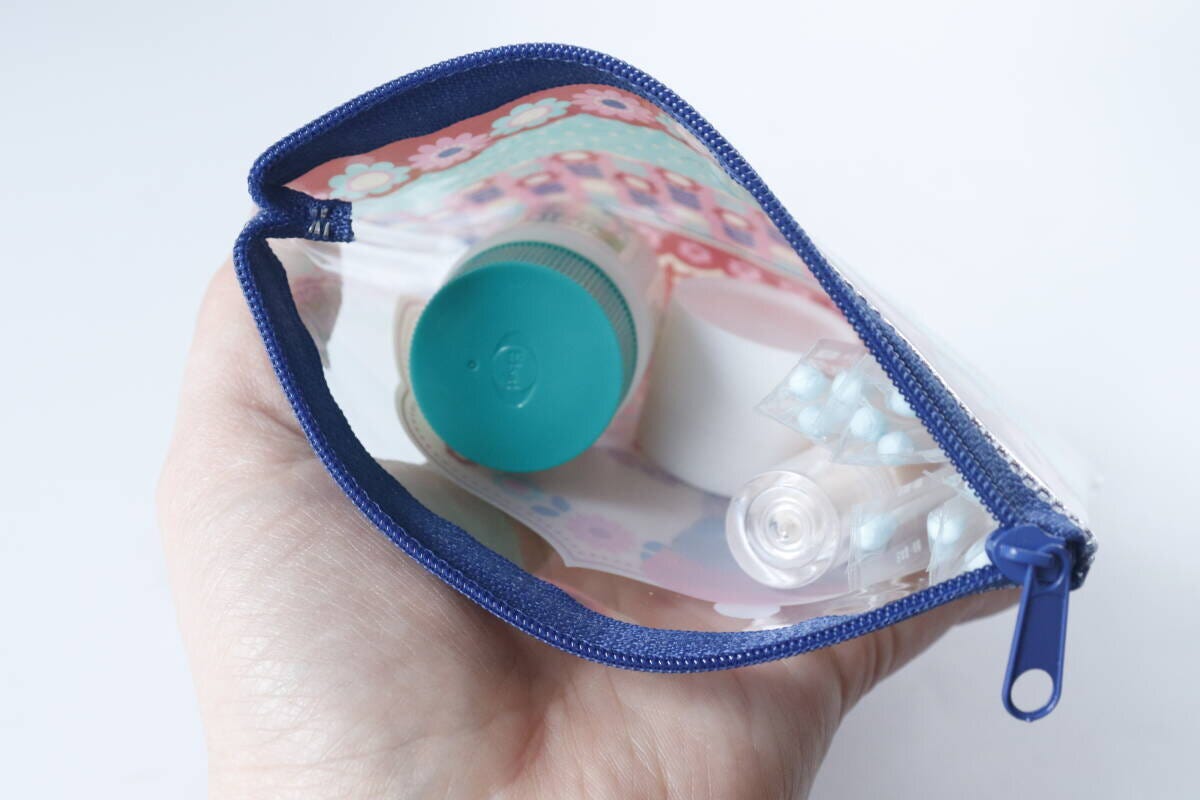 筆者はお直し用コスメやエチケットグッズを入れてみましたが、スッキリと収まりました。常備薬や絆創膏などを入れる衛生用品ポーチとしても優秀です。