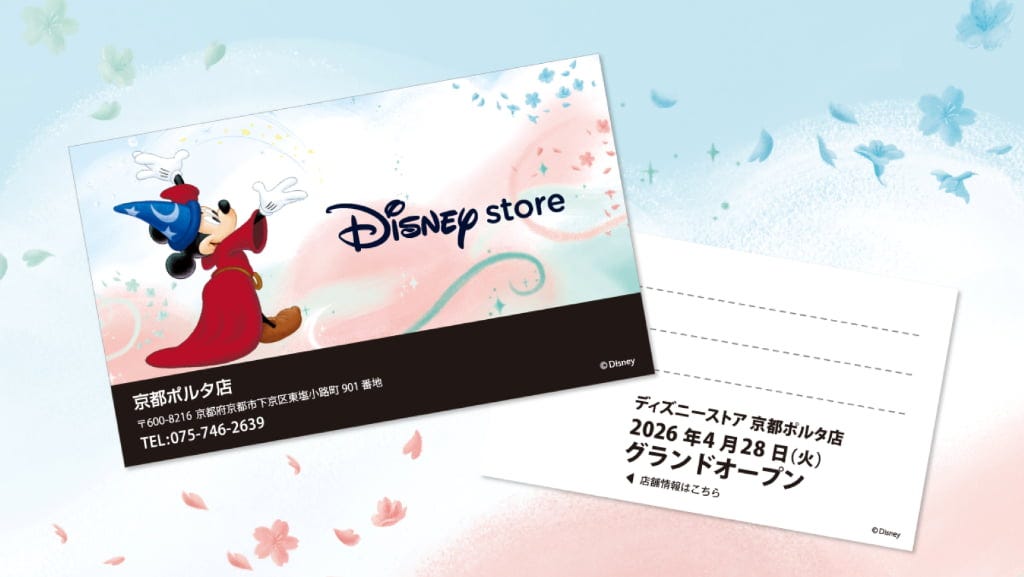 ショップカード また、オープン日の2026年4月28日(火)より、店内で商品を5,000円以上購入した人に、「京都ポルタ店」限定デザインのオリジナルトートバッグをプレゼント。さらに、希望した人は「京都ポルタ店」限定のショップカードがもらえます。いずれも数量限定なので、詳細は「ディズニーストア」のキャストに確認しましょう。