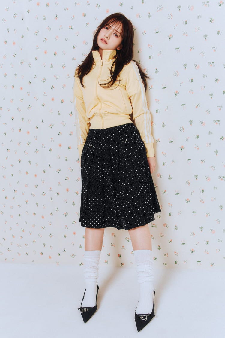 イエロー以外はモノトーンでまとめて脱カジュアル。がんばりすぎてない、ほどよい甘さをプラスできるドット柄に、女みをアピれるヒールでガーリーな雰囲気を演出。