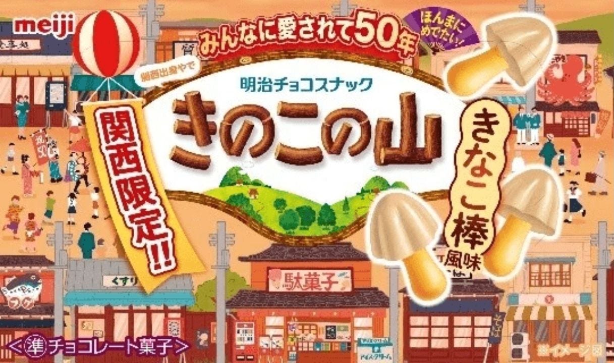 バーチャルで開催される“JR西日本×明治”のコラボレーションにて、2026年4月29日(水・祝)に1日限りのリアルイベントを開催! JR「大阪駅」アトリウム広場で、「きのこの山」の発売満50年を記念した関西限定の新商品「駄菓子屋さんのきなこ棒風味」が無料でもらえるチャンスです。