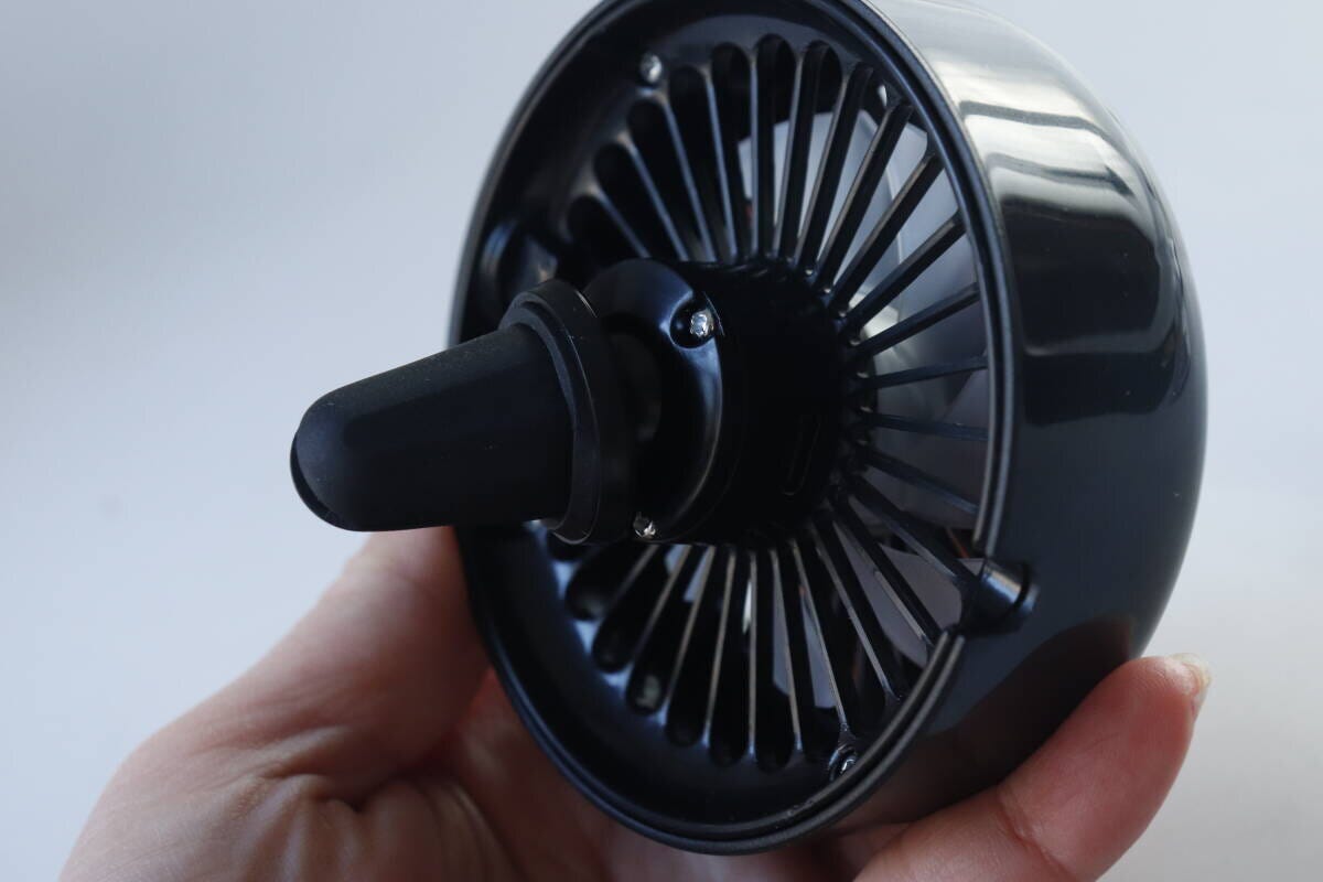 ダイソーの『USB式グラデーションライト付車載扇風機』は、エアコンの送風口に差し込むだけで冷風を効率よく循環させてくれる便利アイテム。