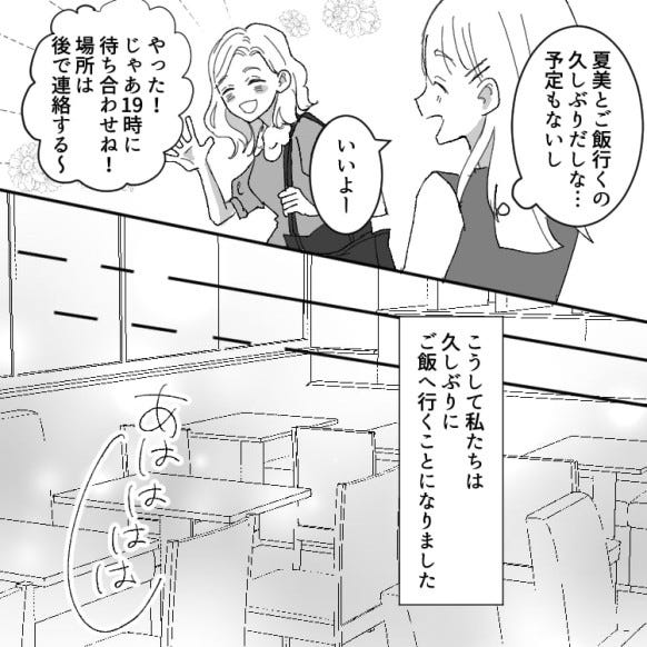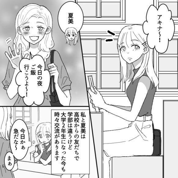 主人公には、夏美という友だちがいます。彼女からご飯に誘われ、行くことになりました。
