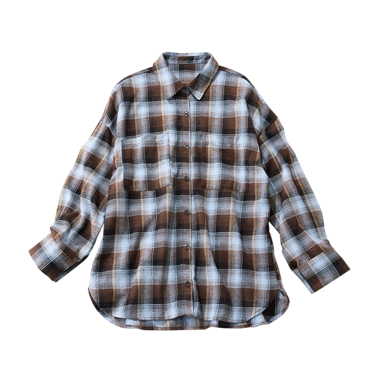 メンズライクな落ち着いた配色のチェック柄シャツ。トップスや羽織りとしてはもちろんのこと、たすき掛けで、コーデのアクセントとして着こなしてみるのも正解。