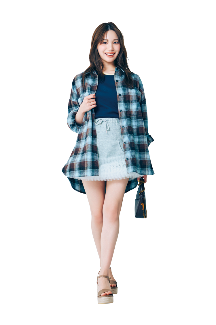 オーバーサイズのチェックシャツを羽織りとして使って、インナーとのゆるピタバランスが映える◎。カジュアルななかにチュールがドッキングされたミニスカで甘さもプラスできる!