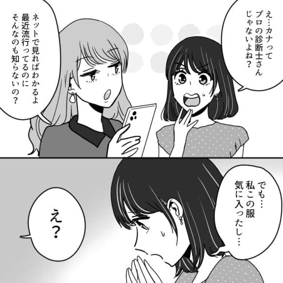 可愛い服があったので試着をすると、カナから骨格を理由に「それ着たら事故るよ」と言われます。