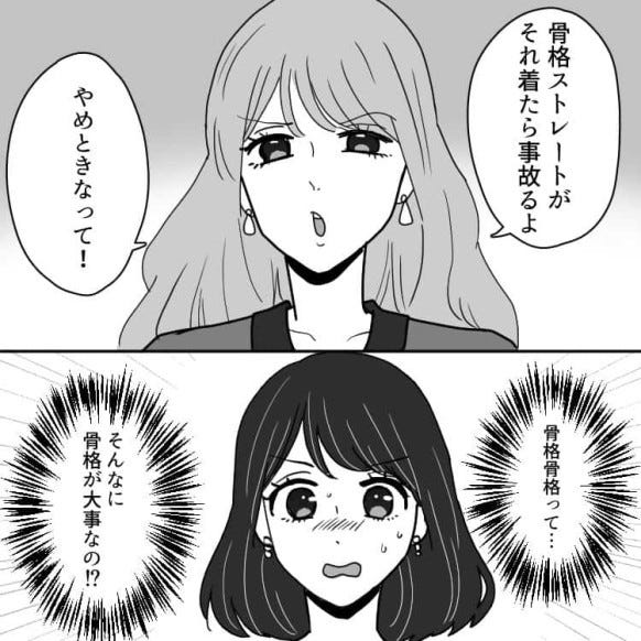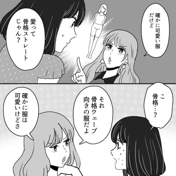 カナから骨格を理由に「それ着たら事故るよ」と言われ、ショックを受ける主人公。