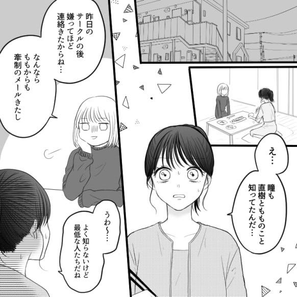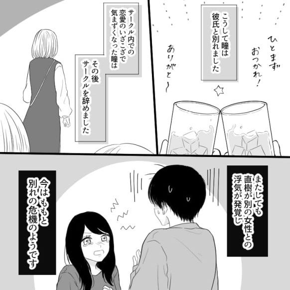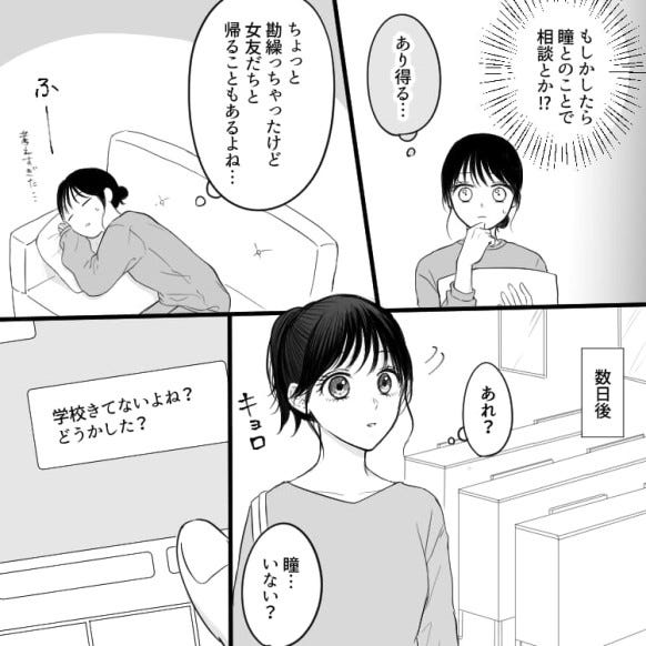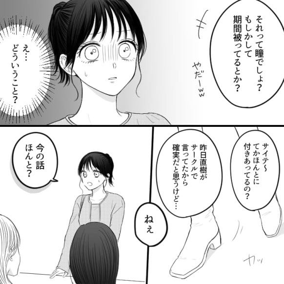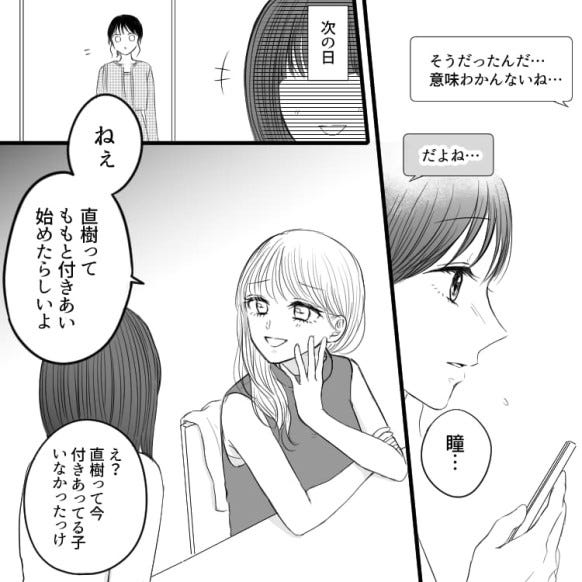 ある日の下校時、志帆は瞳の彼氏・直樹が女性と一緒にいるところを目撃してしまいます。