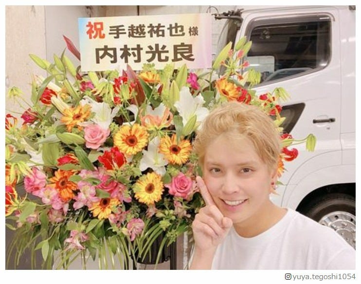 内村光良からのフラワースタンドと写る手越祐也/手越祐也公式Instagramより