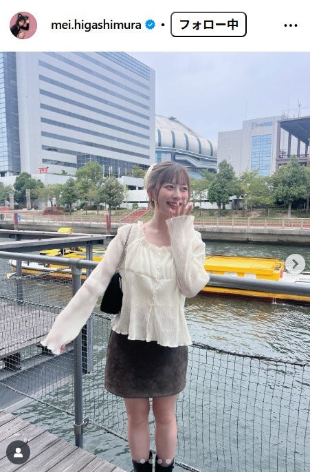 元日向坂46の東村芽依が25日、自身のInstagramを更新。大阪での様子とファッションコーディネ...